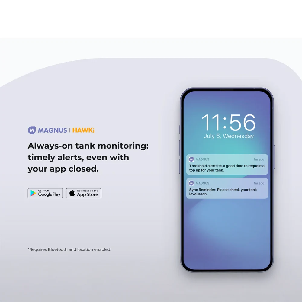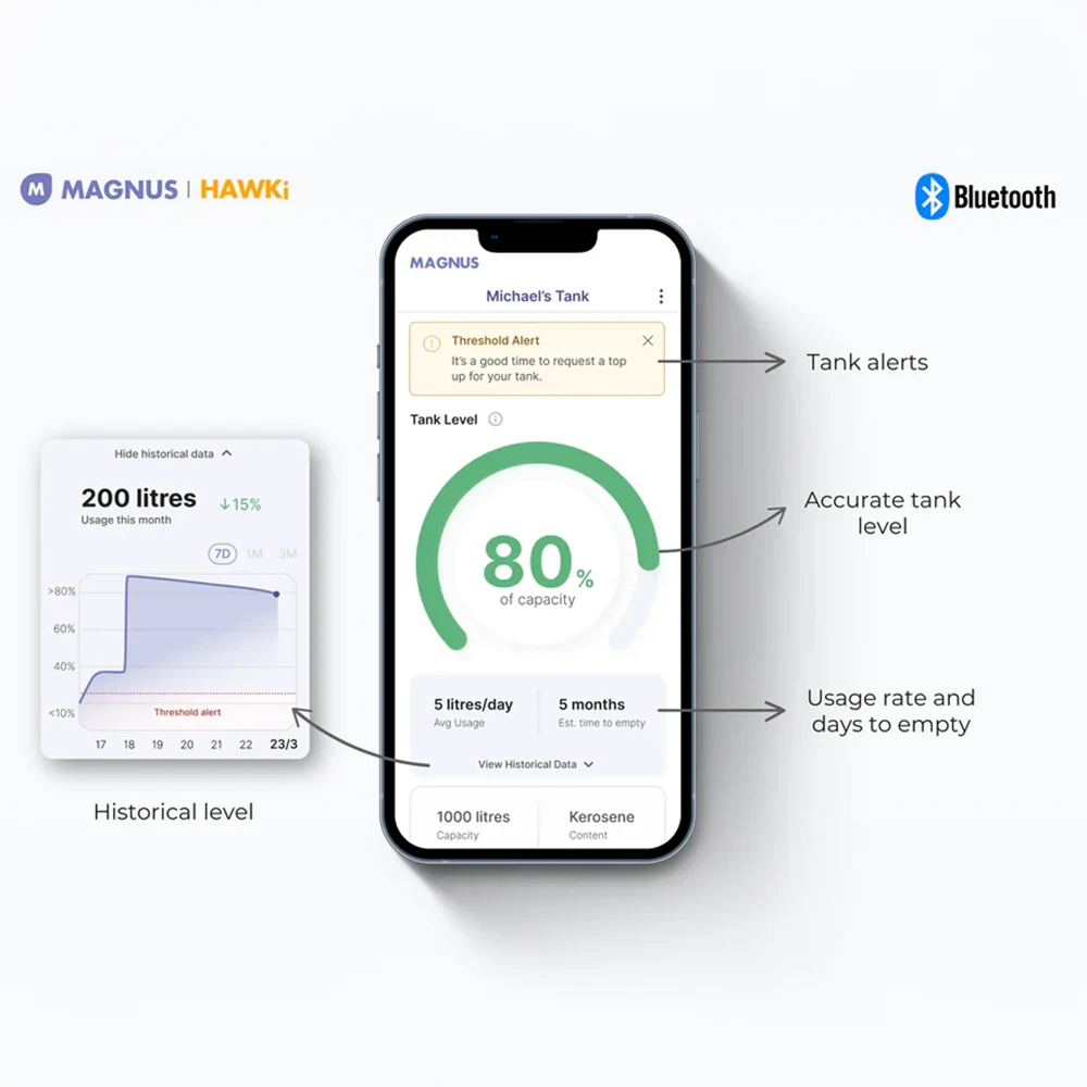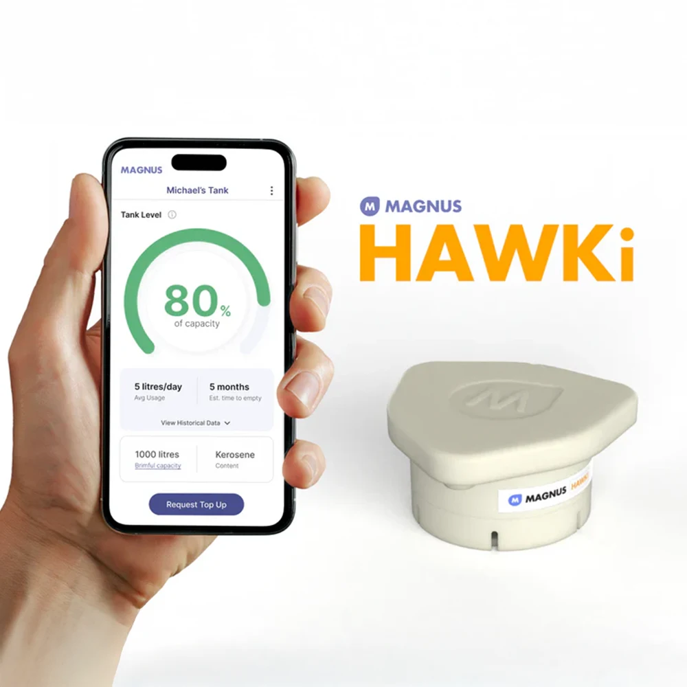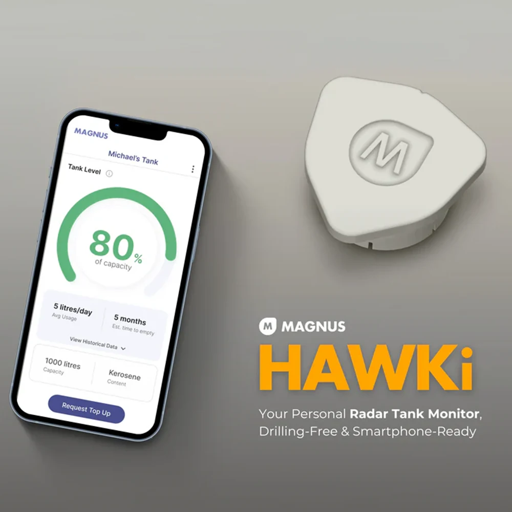 The HAWKi Oil Tank Bluetooth Monitor is a next-generation radar-based tank level sensor designed for accurate, contact-free monitoring of fuels and liquids. Ideal for homeowners, farms, and small businesses, it connects via Bluetooth to your smartphone or computer, giving real-time visibility into tank levels, consumption history, and estimated days until refill.