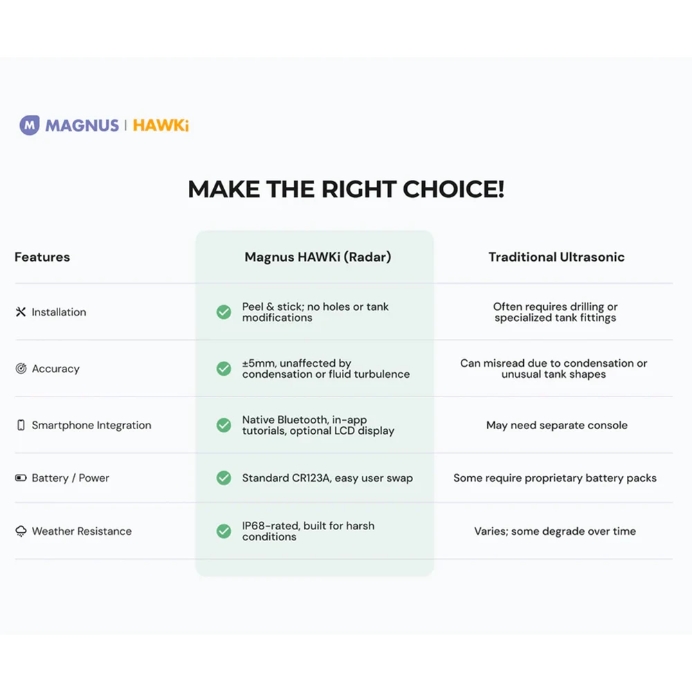 Unlike ultrasonic sensors, the HAWKi’s radar system is unaffected by temperature, condensation, or dust. It measures through plastic tank walls with 5mm precision and installs in minutes using 3M adhesive—no drilling or wiring required. The built-in replaceable CR123A battery lasts up to two years under normal use.