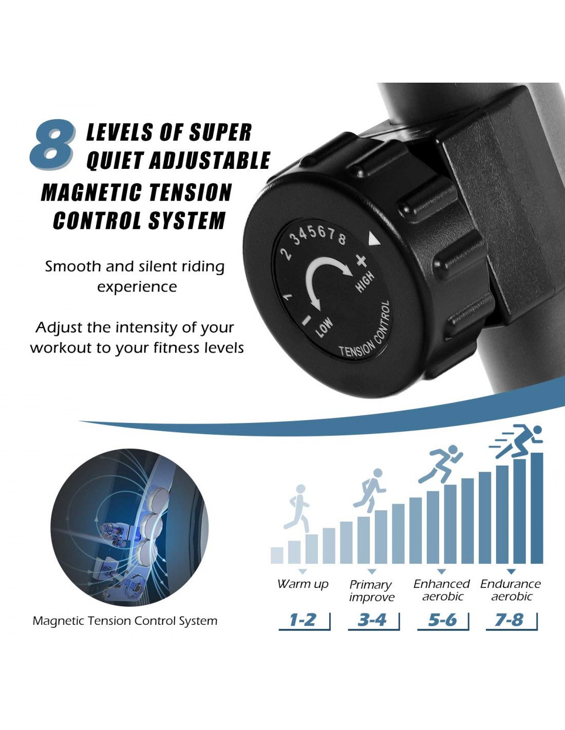 Equipped with an 8 kg flywheel and magnetic braking system, this bike delivers a quiet, fluid riding experience. The magnetic resistance ensures smooth transitions between levels and reduces friction—offering a low-maintenance, durable solution suitable for apartments or shared spaces.