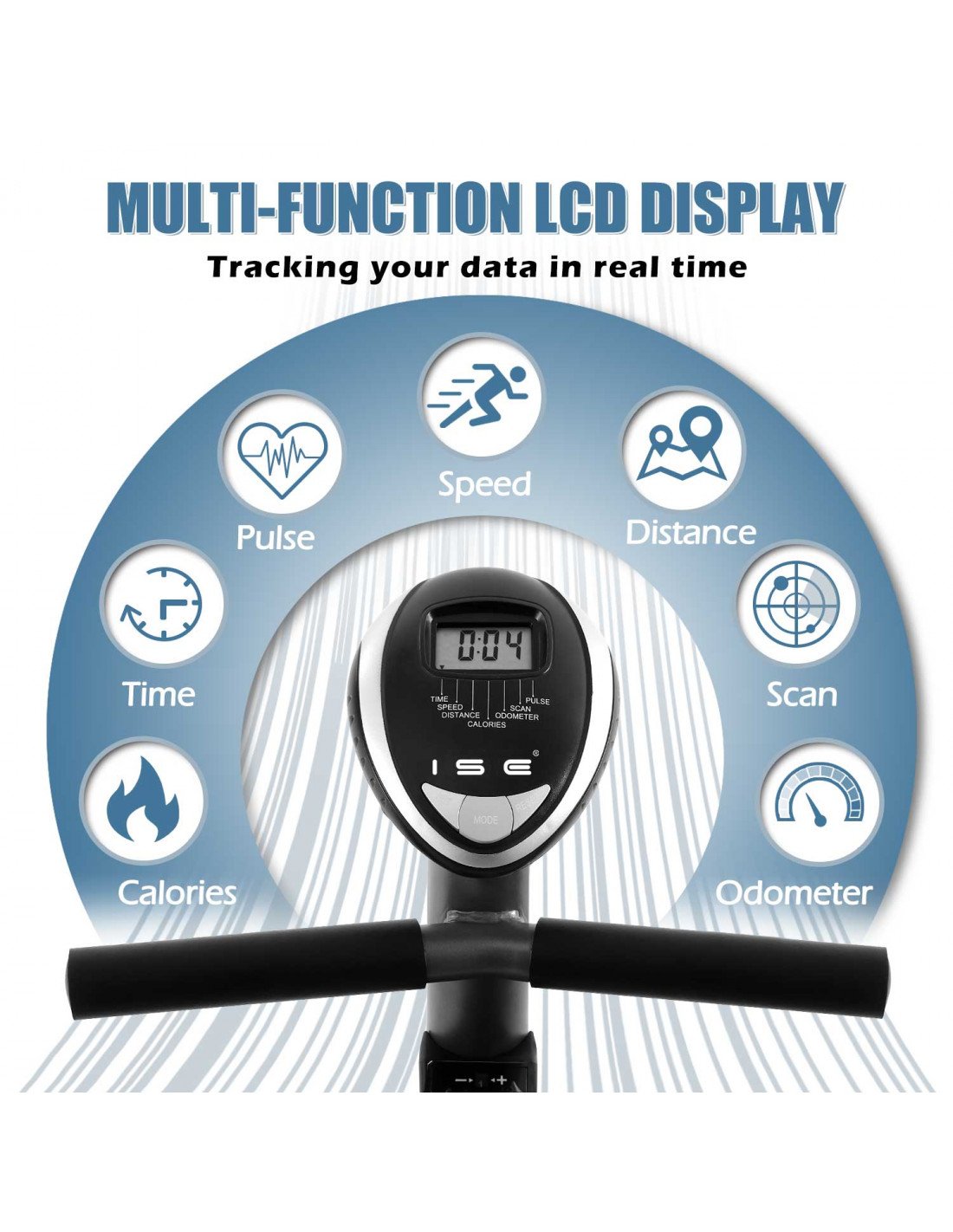 The built-in LCD console tracks your time, speed, distance, calories, total strokes, and includes a scan mode to rotate through metrics automatically. Integrated pulse sensors in the handlebars help you monitor heart rate during your workout and adjust intensity accordingly.